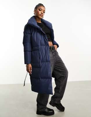 Threadbare Treacle shawl collar oversized puffer coat in navy | ASOS